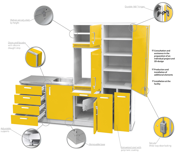 "MEDIN” medical module systems are durable wall all-metal structure with a sandwich design, filled with thermal insulation material. Sinks and work surfaces of cupboards are made of stainless steel. To provide a tight closing and protection against dust penetration the doors equipped silicone sealant. All furniture fittings made by HÄFELE and doors have a hidden tripartite mechanism locking system.Depending on customer need module systems are available in two versions: